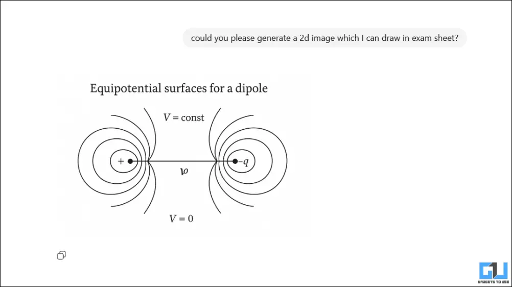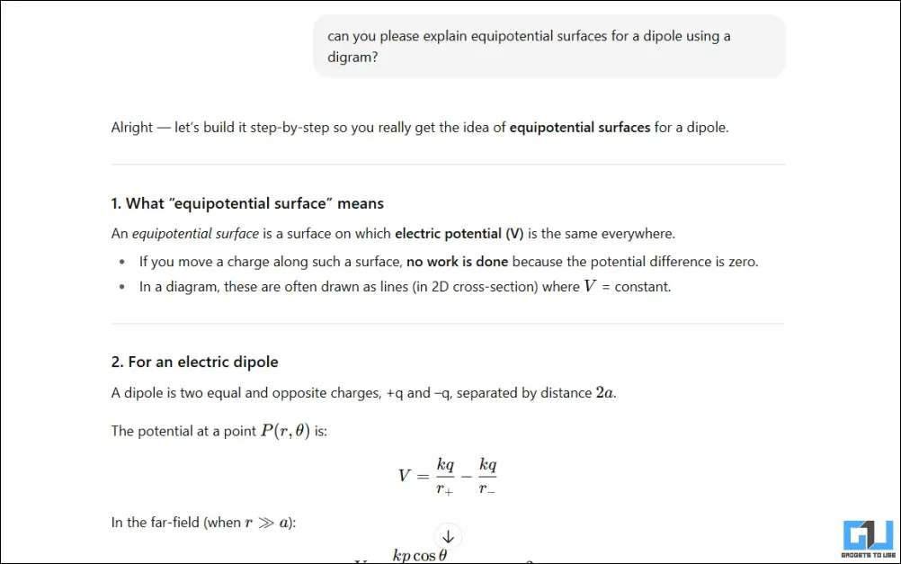 Para testar ainda mais, pedimos ao ChatGPT paraexplicar forças equipotenciais em um dipolo, com um diagrama. Embora este seja um tópico simples, é difícil explicá-lo sem contexto prévio, tornando este um teste crucial. O chatbot primeiro respondeu com uma explicação do tópico, seguida por uma derivação passo a passo da equação e da fórmula.