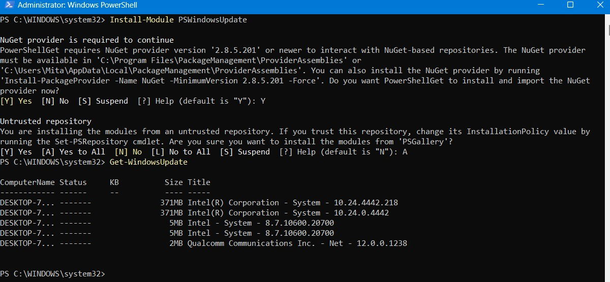 Install-Module PSWindowsUpdatePode ser solicitado que você instale e importe o provedor NuGet. Pressione Y para Sim e deixe instalar o pacote.
