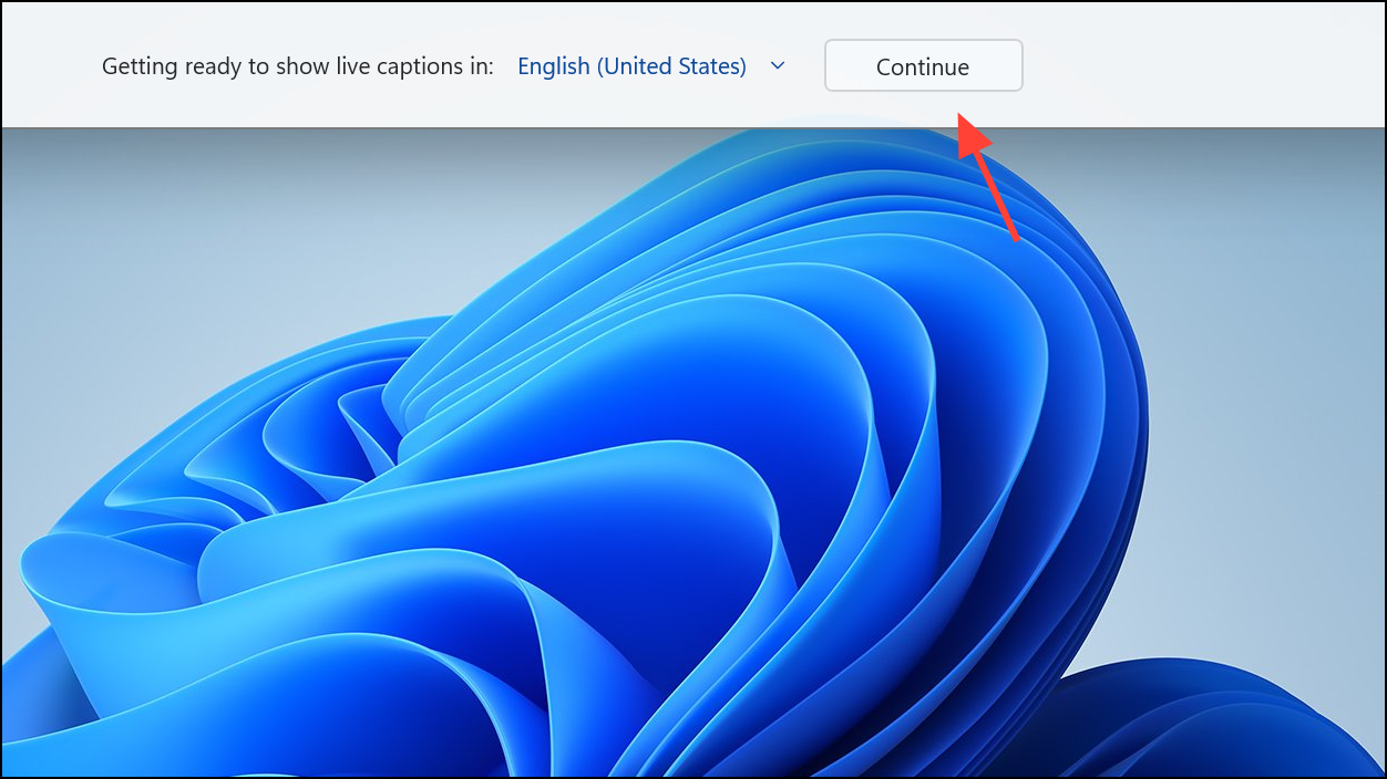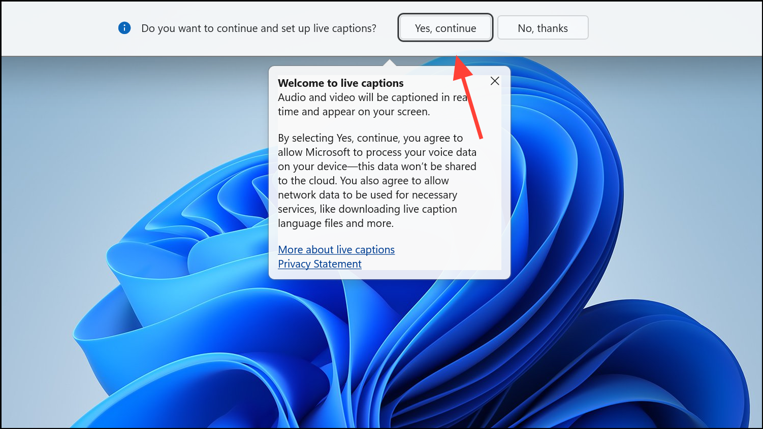 Etapa 1:Pressione o atalho do tecladoWindows + Ctrl + Lpara ativar ou desativar instantaneamente as legendas ao vivo. Na primeira vez que você ativar esse recurso, o Windows perguntará se você deseja configurar legendas ao vivo. Clique em “Sim, continuar” para prosseguir. Esta configuração inicial acontece apenas uma vez e permitirá que o Windows baixe os arquivos de idioma necessários para legendas.