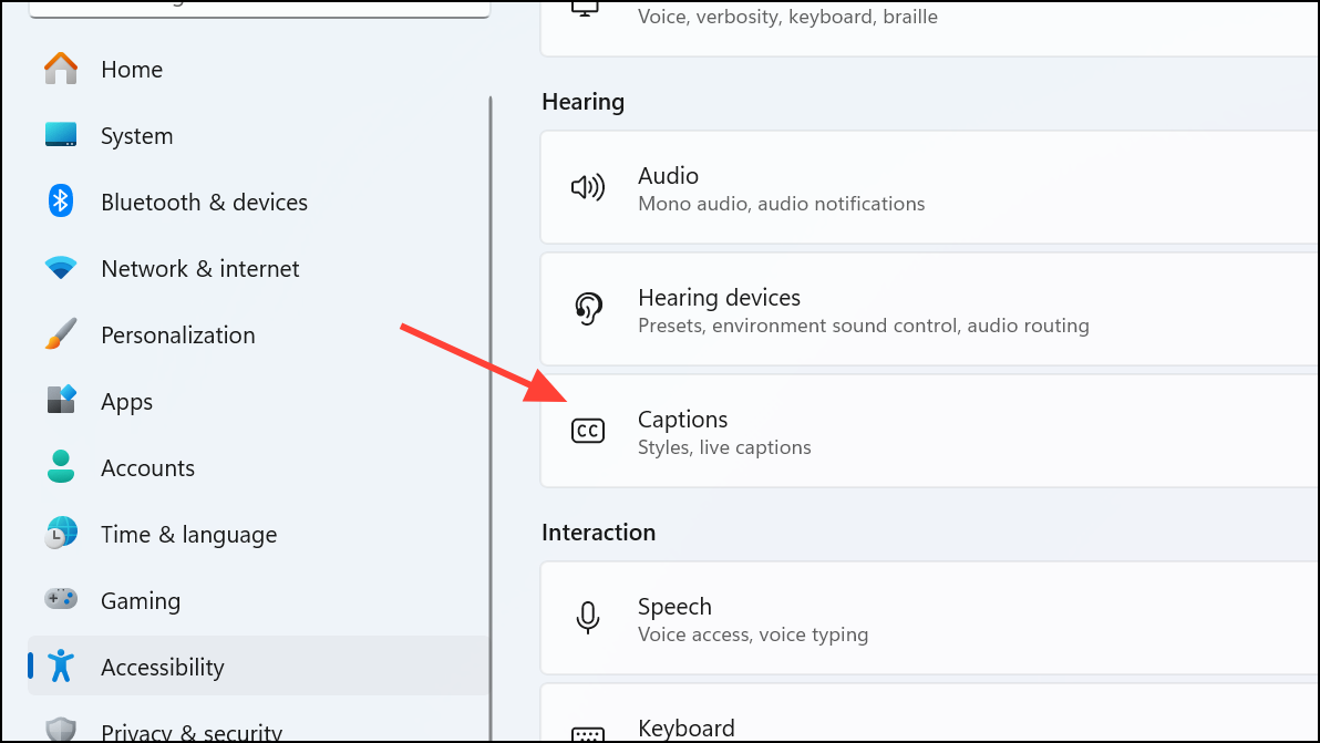 Etapa 2:Na página Acessibilidade, selecione "Legendas" na seção Audição.