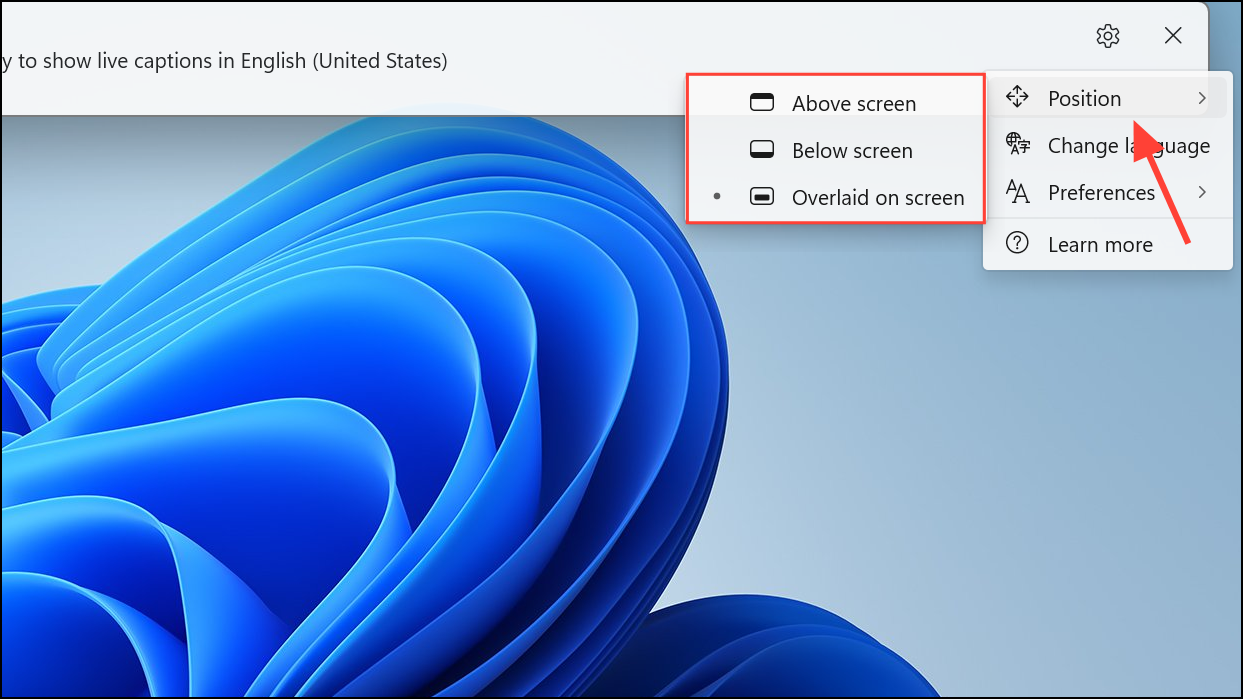 Etapa 2:Selecione “Posição” para escolher onde as legendas aparecem: “Acima da tela”, “Abaixo da tela” ou “Sobreposto na tela”. A opção “Sobreposto na tela” cria uma janela móvel e redimensionável que você pode arrastar para o local de sua preferência.