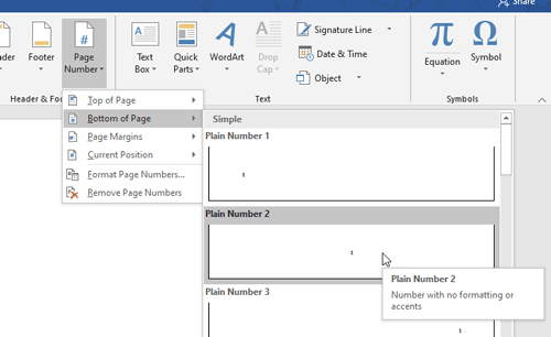 Primeiro, você precisa abrir o documento Word onde deseja inserir o número da página. Depois disso, vá para oInserirguia. Aqui você pode encontrarNúmero da páginaopção noCabeçalho e rodapéseção. Clique nele e selecioneNúmero> Parte inferior da página.
