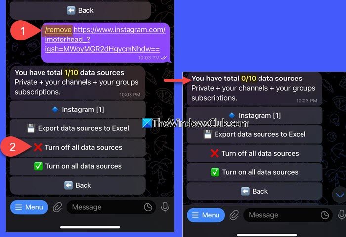 Para remover uma conta específica do Instagram (ou qualquer outra fonte) do seu feed, use o/removecomando seguido pelo link da conta. Em seguida, toque na opção apropriada.