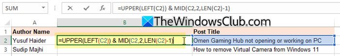 (UPPER(LEFT(C2)))com o texto restante(MID(C2,2,LEN(C2)-1)).