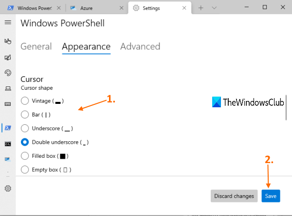 Se você quiseralterar o formato do cursor para um perfil no Terminal do Windows no Windows 10, então esta postagem pode ser útil. Por padrão, quando você acessa um perfil (por exemplo, PowerShell ou prompt de comando) em, o cursor fica visível no formato de barra (┃). Mas existemMais 5 formas de cursordisponível que você pode usar para um perfil específico do Terminal do Windows.