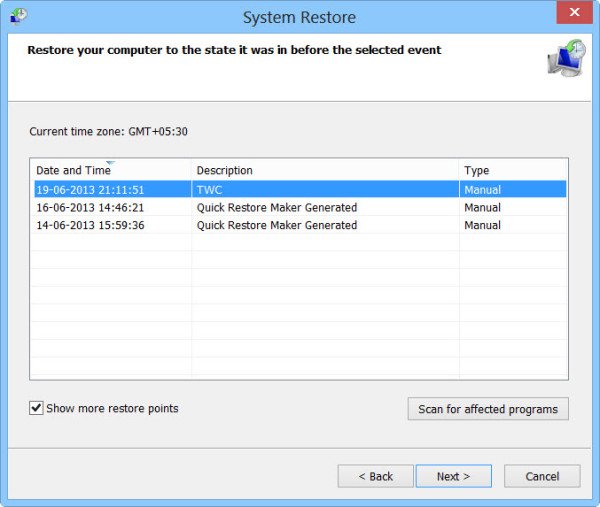 Clicando noProcure programas afetadosO link listará os programas e arquivos que podem ser afetados se você restaurar o computador usando a restauração do sistema ou se você desfazer a restauração do sistema.
