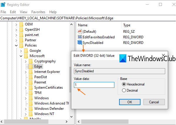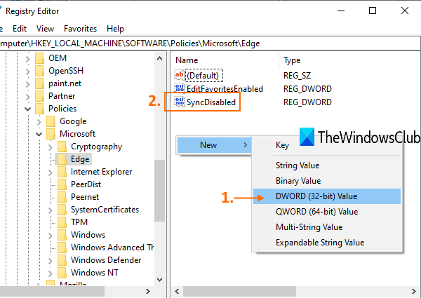 - CriarSincronização desativadanomeie o valor DWORD na chave Edge