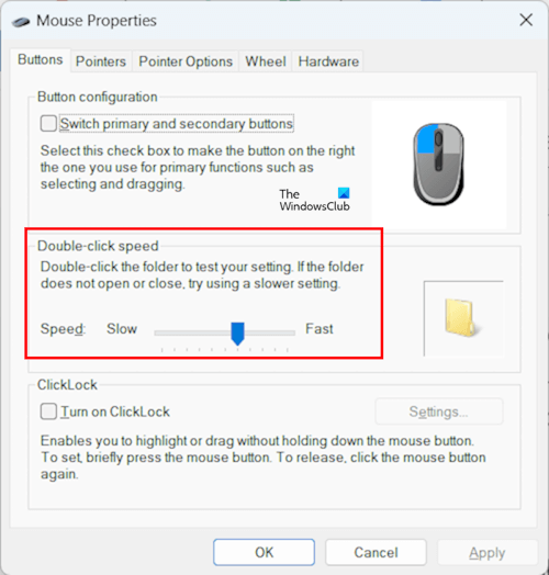 Para alguns usuários, alterar a velocidade do clique duplo de rápido para lento funcionou. Você pode alterar o clique duplo para rápido ou lento e ver qual deles funciona para você.