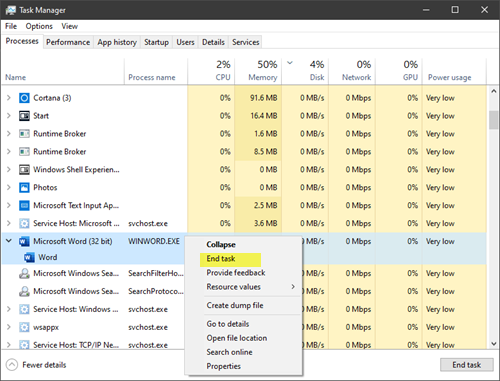Abra o Gerenciador de Tarefas, localizeWINWORD.EXE, clique com o botão direito nele e selecioneFinalizar tarefa. Em seguida, reinicie o aplicativo Office.