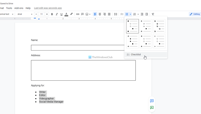 Conforme mencionado anteriormente, não há opção direta no Google Docs para criar qualquer formulário. No entanto, você pode usar a funcionalidade de tabela para começar a criar um formulário. Por outro lado, você também pode inserir caixas de seleção. Porém, para isso, você precisa usar a opção de marcadores e transformá-la em checklist.