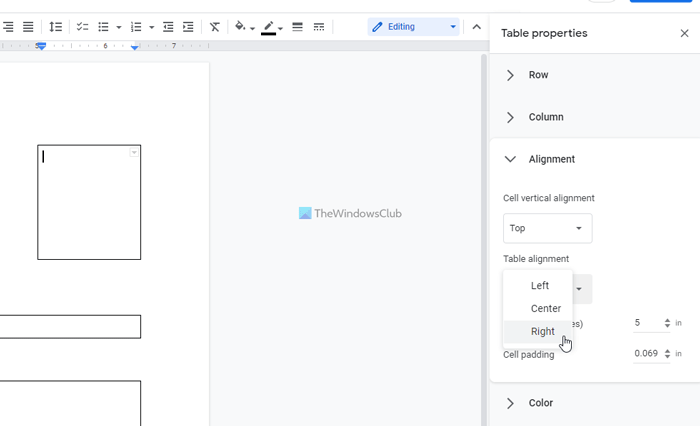 A seguir, expanda oAlinhamentoseção e escolhaCertodoAlinhamento da tabelalista.