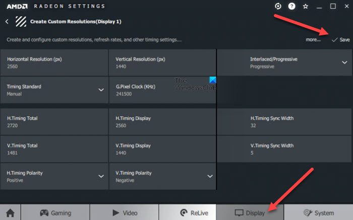Depois de clicarSalvar, Radeon Settings verificará a compatibilidade das novas configurações com o monitor. Se compatível, as novas configurações serão salvas como umpredefinidosob oResoluções personalizadasmenu.
