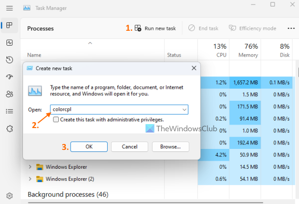 Semelhante à caixa Executar Comando, você pode executar uma nova tarefa eme abra a janela Gerenciamento de cores a partir daí. Para fazer isso: