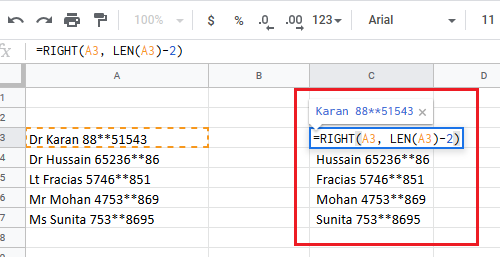 Escreva esta fórmula na célula C3. Pressione Enter e o texto na célula A3 será exibido sem os dois primeiros caracteres na célula C3. Clique em qualquer lugar fora da célula C3 e depois novamente na célula C3 para destacar a opção Preencher. Agora arraste a fórmula para a célula C7. Isso fornecerá os textos sem os dois primeiros caracteres na coluna C para os textos iniciais na coluna A.