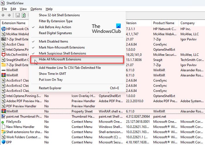 Embora ShellExView já marquenão Microsoftextensões de shell emrosacolor, você pode ocultar as extensões internas (Microsoft) da visualização para facilitar o gerenciamento ou a manipulação das extensões. Clique noOpçõesmenu na parte superior da janela ShellExView e selecione oOcultar todas as extensões da Microsoftopção.