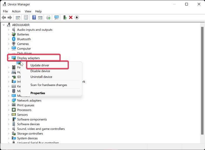 - Clique com o botão direito noDriver de vídeo NVIDIAopção e selecioneAtualizar driver.