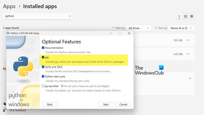 Ao instalar o Python, você deve ter notado, ele pede permissão para instalar alguns serviços, incluindo PiP. A maioria de nós tende a conceder permissão, mas alguns não. Se você for um deles, não poderá instalar bibliotecas Python usando PiP. É por isso que pedimos que você execute o pacote de instalação novamente e marque a caixa associada ao PiP. Siga as etapas prescritas para fazer o mesmo.