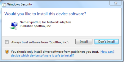 Depois de baixar e instalar o SpotFlux, ele adicionou um novo componente ao meu computador. Era um adaptador de rede virtual e estava listado em Adaptadores de rede no Gerenciador de dispositivos (Windows Key + Prnt Scr).