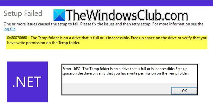 Ao tentar instalar ou atualizar qualquer aplicativo como .NET Framework, Adobe Acrobat, Microsoft Visual C++ Redistributable e muito mais, você poderá encontrar uma mensagem que dizA pasta Temp está em uma unidade cheia ou inacessível, Erro 1632 ou 0x80070660.Neste post vamos falar sobre esse problema e ver o que você pode fazer para resolvê-lo.