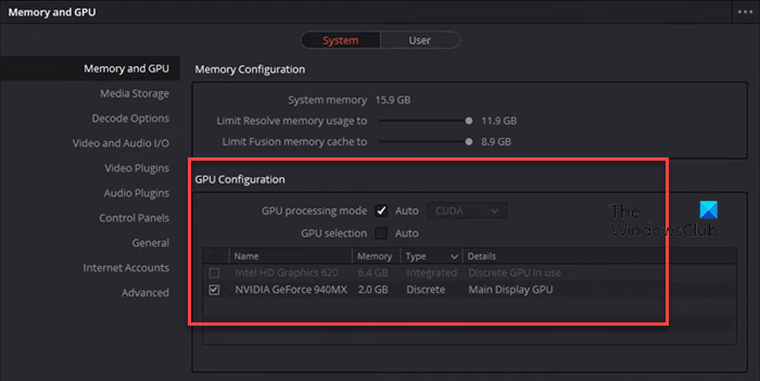 Nosso primeiro passo é verificar e ter certeza de que a GPU está configurada no DaVinci Resolve. Para fazer isso, você precisa clicar no botãoAtualizar configuraçãobotão da caixa de mensagem de erro. Então, vá para oMemória e GPUguia e verifique oConfiguração de GPUseção. OModo de processamento GPUdeve ser verificado e definido como Auto, e sua GPU dedicada deve estar habilitada. Após fazer as alterações, saia do painel de configurações e reinicie o aplicativo para verificar se o problema persiste.