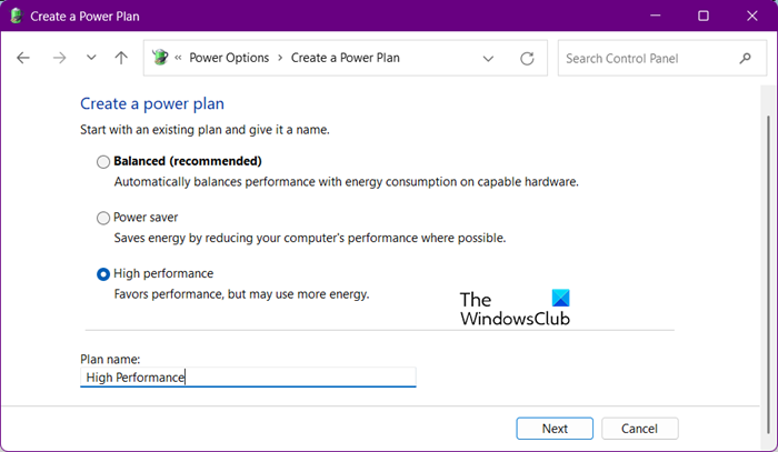 - Caso não esteja disponível, clique emCrie um plano de energia,e selecioneAlto desempenho.