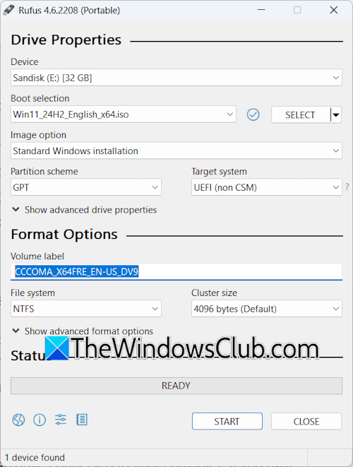 Ele detectará automaticamente a unidade flash USB conectada ao seu computador. Se você conectou várias unidades flash USB, selecione a correta para torná-la uma unidade inicializável com Windows 11 ISO. Agora, clique noSELECIONARbotão e selecione o arquivo ISO do Windows 11 em seu sistema. Com base no esquema de partição do seu disco rígido, selecione a opção correta. Sob oOpções de formatoseção, deixe todas as opções com seus valores padrão. Você também pode renomear a unidade flash USB ou deixar esta opção como está.