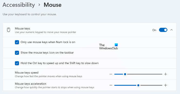 - Ligue o interruptor ao lado doTeclas do mouseopção.