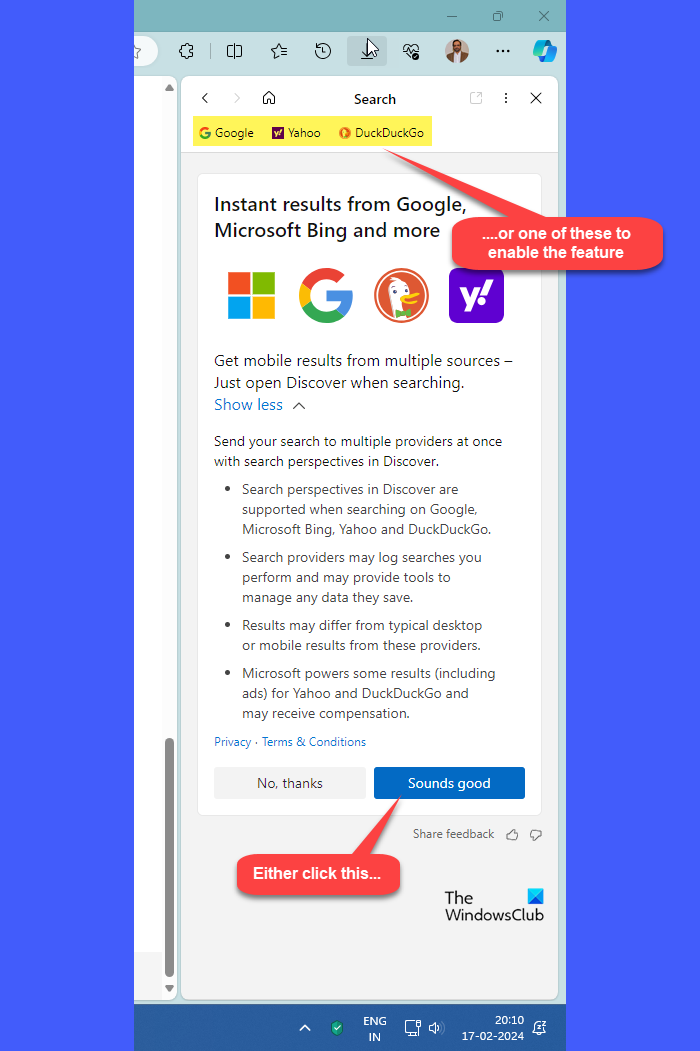 Opadrãomecanismo de pesquisa na pesquisa da barra lateral éGooglemas alguns usuários preferem. No entanto, após uma atualização recente, agora você também pode mostrar resultados de outros mecanismos de pesquisa, incluindo Google, DuckDuckGo, DuckDuckGo e Yahoo ao mesmo tempo na barra lateral. Neste post veremos comopesquise em vários mecanismos simultaneamentena borda.