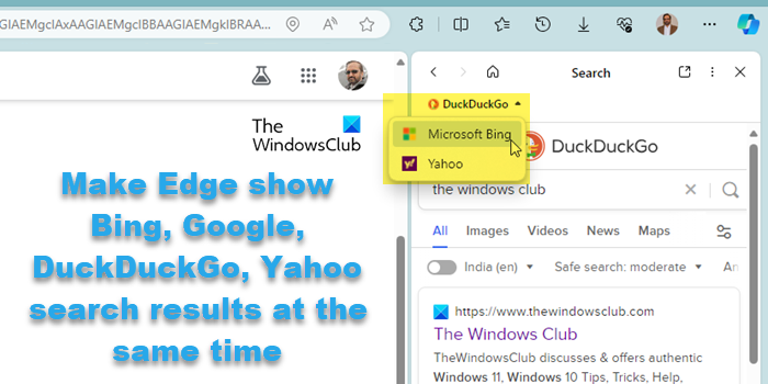 Neste post, mostraremos comofaça o Edge mostrar os resultados de pesquisa do Bing, Google, DuckDuckGo e Yahoo ao mesmo tempo. O Edge apresenta uma barra lateral que permite aos usuários acessar rapidamente ferramentas e recursos essenciais junto com as guias do navegador. Uma dessas ferramentas, conhecida comoPesquisa na barra lateral, permite que os usuários pesquisem na web sem abrir uma nova guia ou sair da página em que estão.