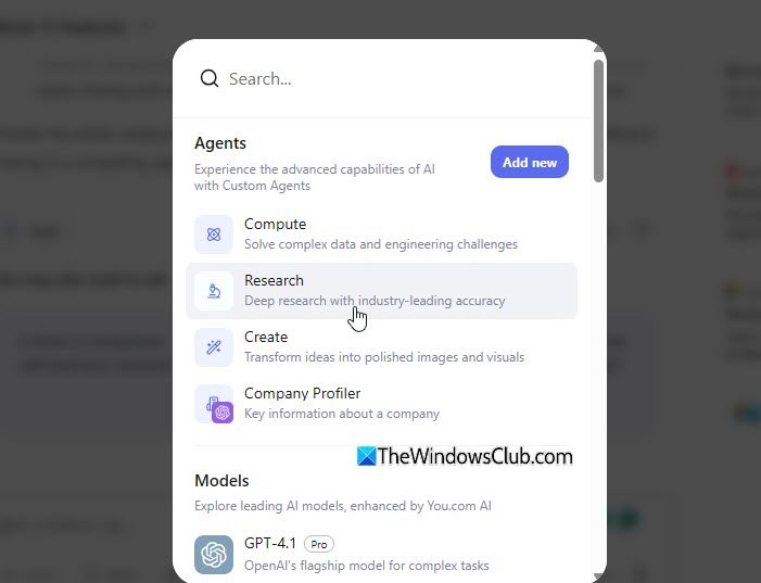 - Autoé a configuração padrão de agente/modelo de IA em You.com. Ele seleciona dinamicamente o Agente ou Modelo mais apropriado com base na sua consulta. Para personalizar esta configuração, clique emAutona caixa de entrada da consulta, selecionePersonalizadoe escolha entre os agentes/modelos de IA disponíveis que melhor atendem às suas necessidades específicas.