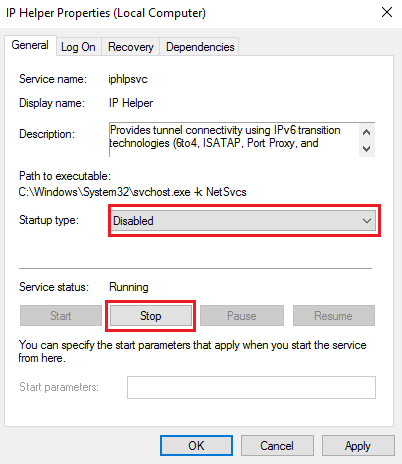 3] Defina o tipo de inicialização para “Desabilitado” e cliqueAplicarpara salvar as configurações.