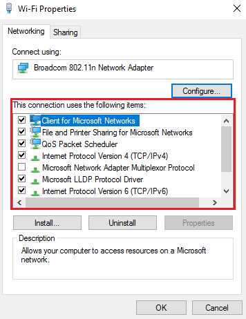 Na lista, localize “A rede usa os seguintes itens”, e certifique-se de que os seguintes itens estejam marcados – e desmarque todas as outras opções: