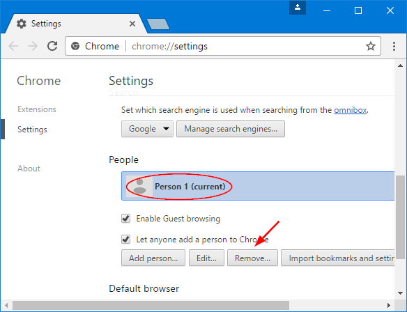 - În secțiunea Persoane a paginii Setări, selectați profilul actual și faceți clic peEliminabutonul de dedesubt. După ștergere, Chrome va configura automat un nou profil cu setări implicite.