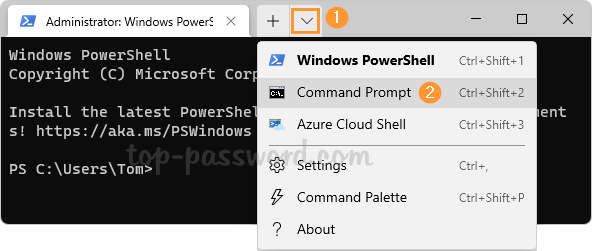 - Pentru a începe, deschideți Windows Terminal ca administrator. Dacă terminalul Windows deschide PowerShell în mod implicit, faceți clic pe butonul săgeată în jos situat în bara de titlu și selectați „Prompt de comandă“.