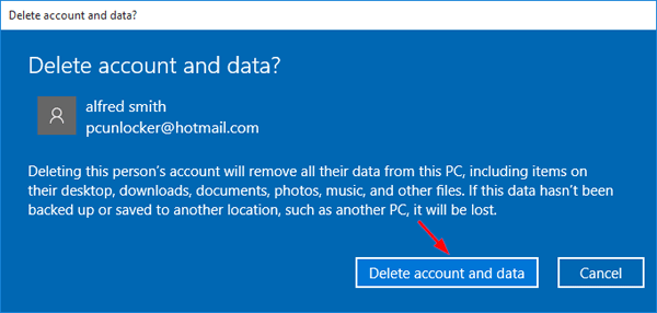 - Când apare caseta de dialog de confirmare, faceți clic pe „Ștergeți contul și datele” pentru ștergerea contului Microsoft selectat în prezent.