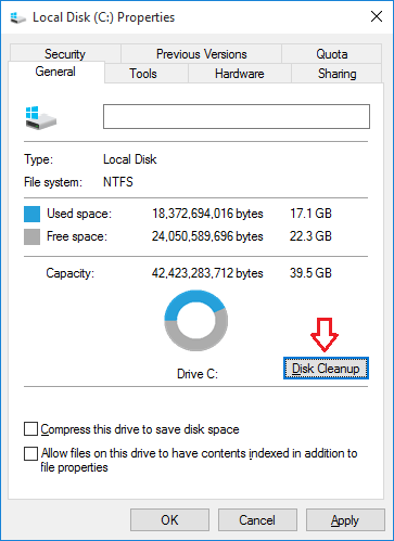 Când se deschide caseta de dialog Drive Properties, faceți clic peGeneralfila. De acolo puteți face clic peCurățare discbutonul pentru a elibera spațiu pe unitate.