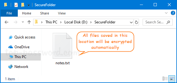 - Acum puteți deschide folderul securizat din Windows Explorer. Toate fișierele pe care le-ați salvat în acest folder vor fi criptate automat înainte de a le scrie pe discul fizic.