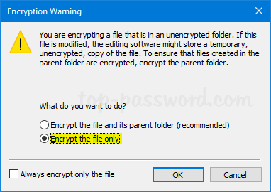 - Va apărea o fereastră care vă va întreba dacă doriți sau nu să criptați fișierul și folderul părinte. Selectați „Criptați numai fișierul” și faceți clicBine.