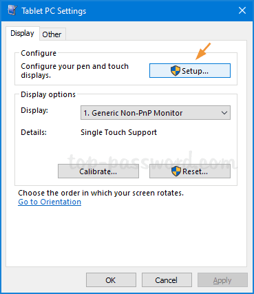 - În fila Afișare, faceți clic peÎnființat. Urmați instrucțiunile de pe ecran pentru a vă identifica ecranul ca ecran tactil.