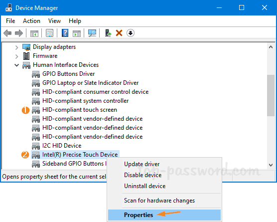 - Deschideți Manager dispozitive și extindeți „Dispozitive de interfață umană„. Trebuie să dezactivăm economisirea energiei pentru fiecare dispozitiv legat de ecranul tactil. Faceți clic dreapta pe dispozitivul aferent (de exemplu, „Dispozitiv tactil precis Intel(R)”) și selectațiProprietăți.