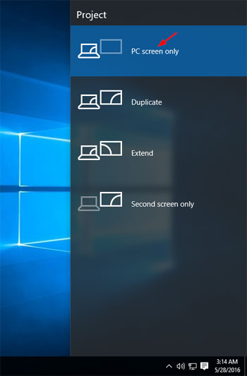 - Veți primi o fereastră de dialog pop-up cu câteva opțiuni, cum ar fi doar ecranul computerului (sau numai computerul), Duplicare, Extindere etc. Asigurați-vă că este setat laDoar ecranul PC-ului.