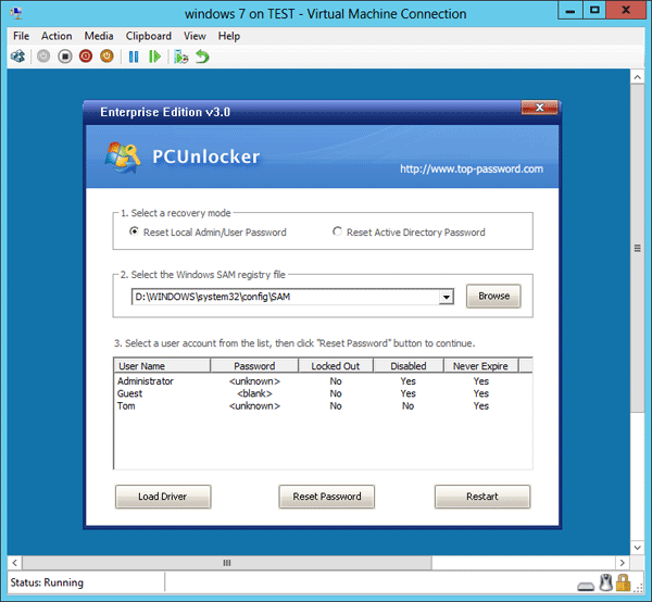 Acum ați resetat cu succes parola Windows pierdută pentru serverul Hyper-V. Demontați imaginea ISO PCUnlocker de pe unitatea DVD a mașinii virtuale și reporniți mașina virtuală. Apoi vă puteți conecta din nou la serverul Hyper-V fără o parolă! Această metodă funcționează cu toate versiunile de mașină virtuală Windows care rulează în Microsoft Hyper-V, inclusiv Windows 8/7/Vista/XP și Windows Server 2012/2008/2003/2000.