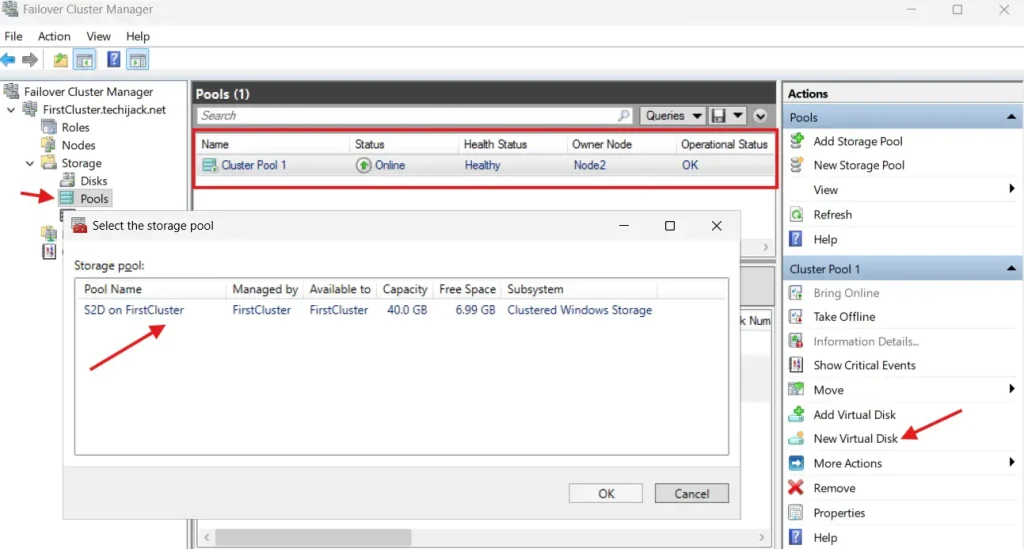 Puteți crea discul virtual făcând clic pe New Virtual Disk din clusterul de failover, apoi creați un volum în oglindă și formatați-l.