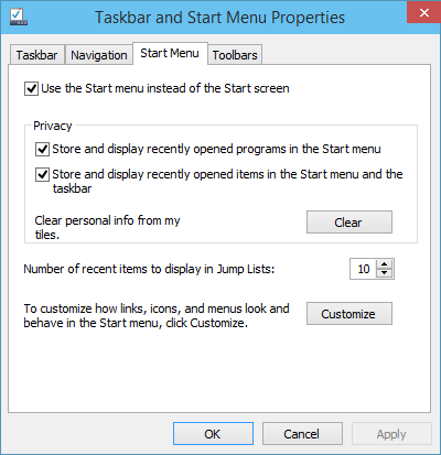 ÎnProprietăți bara de activități și meniul Startcaseta de dialog, selectațiMeniul Startfilă, faceți clicPersonalizați.