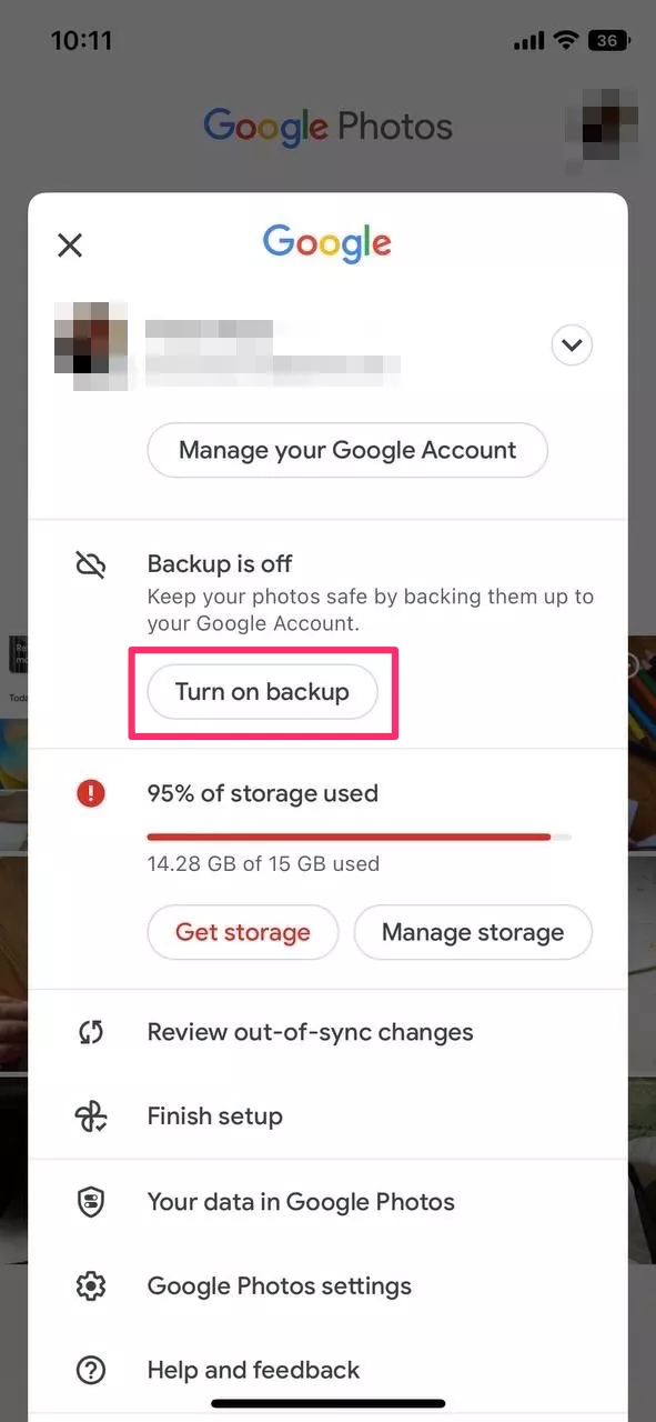 - Îndreptați-vă spreBackup și sincronizaresecțiune. Dacă încă nu ați făcut backup pentru fotografiile dvs., veți vedea pictograma nor. RobinetActivați backupulși așteptați până când fotografiile sunt mutate în nor. Apoi, dezactivați backupul.