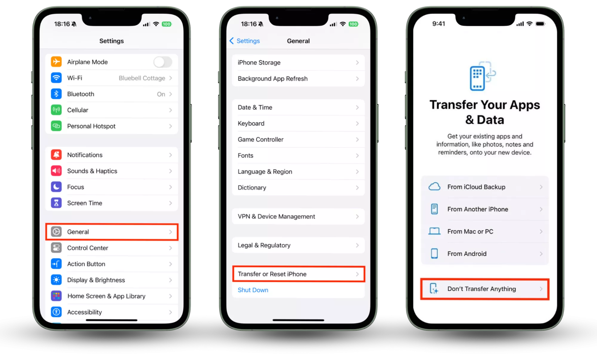 În Setări, atingeți General > Transfer sau Resetare, apoi urmați pașii. În timpul configurării, selectați Nu transferați aplicații și date.Concluzie