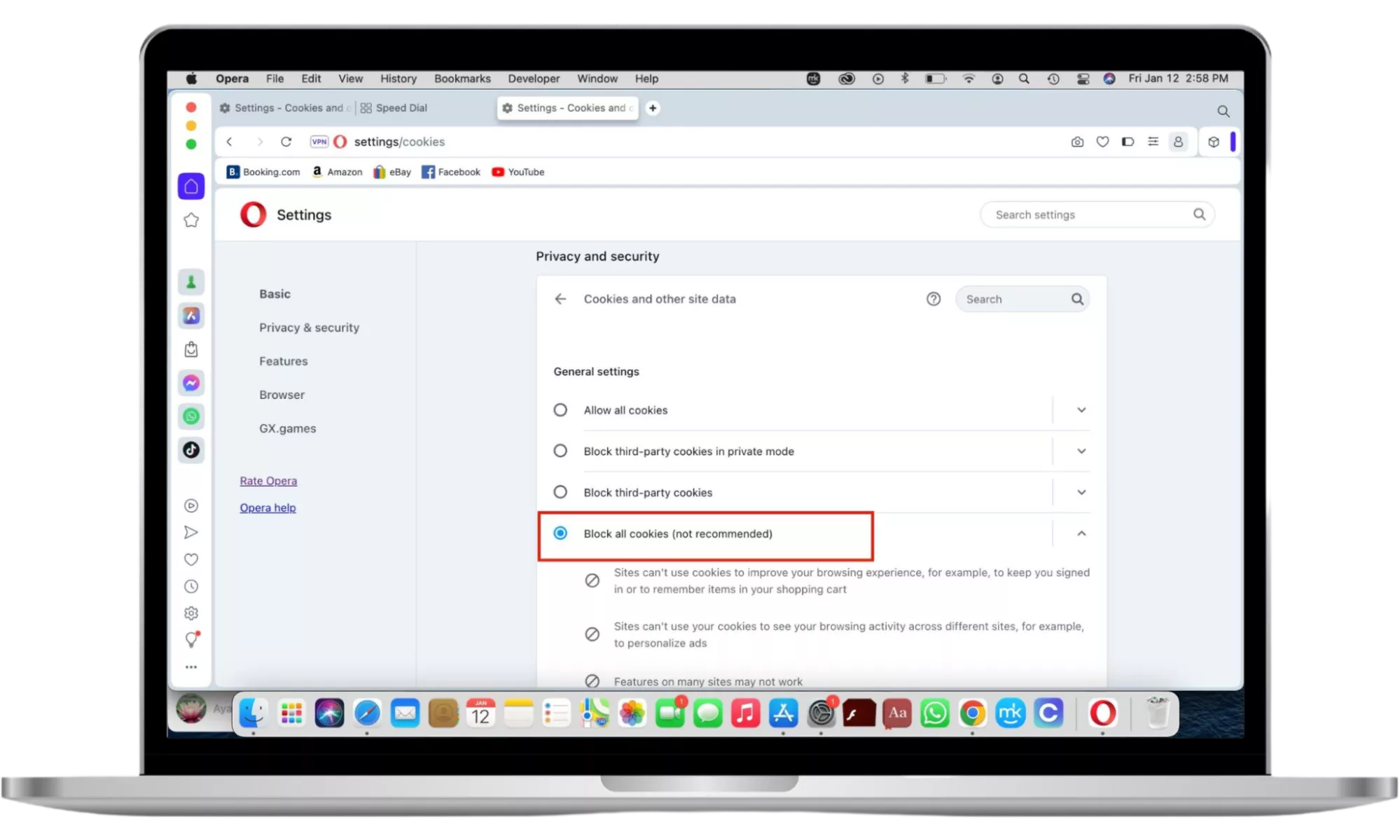 Pentru a bloca cookie-urile în Opera pe un dispozitiv MacBook, urmați acești pași:
