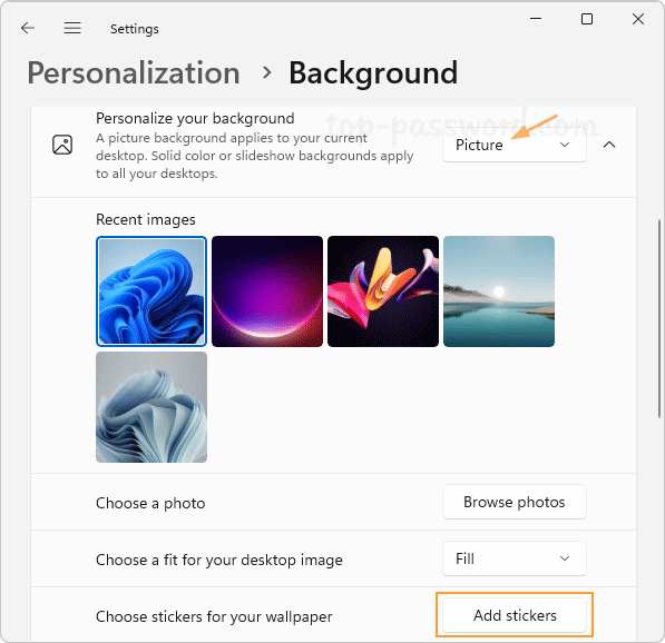 - Înainte de a începe, deschideți aplicația Setări și accesați:Personalizare->Fundal, asigurați-vă că „Personalizează-ți fundalul„ lista derulantă este setată la „Imagine“.