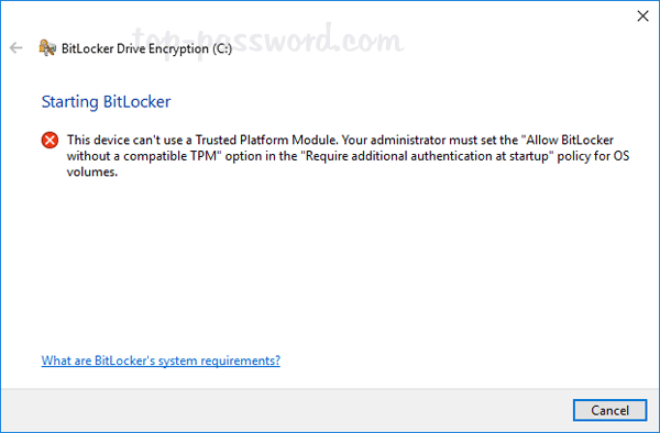 BitLocker este o funcție utilă de criptare a hard disk-ului în versiunile Ultimate și Enterprise ale Windows 10/8/7/Vista, care vă permite să criptați o întreagă unitate fixă. Dacă încercați să activați BitLocker pe un computer vechi fără cip TPM, veți primi unul dintre următoarele mesaje de eroare: