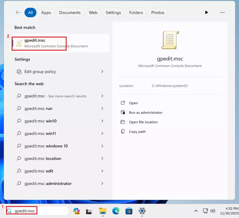 Pasul 1:Tastați „gpedit.msc” în bara de căutare și apoi faceți clic pe Cea mai bună potrivire.